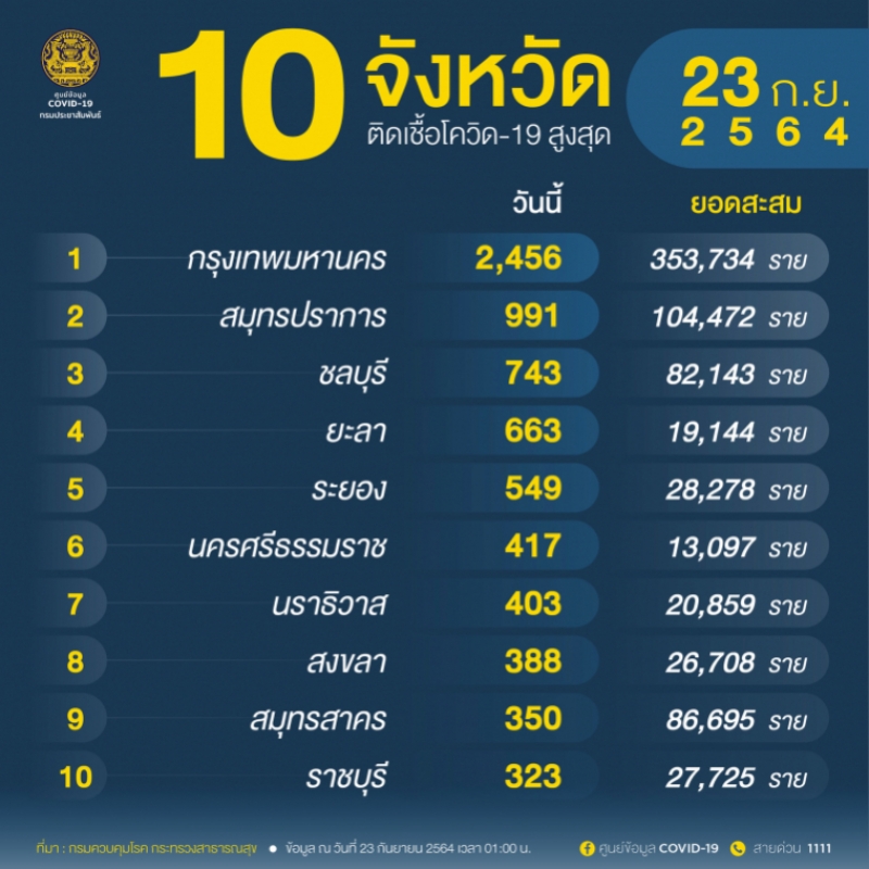 อัพเดทต่อเนื่อง เกาะติดสถานการณ์ CVวันนี้ เกาะติดความคืบหน้า จากศูนย์บริหารสถานการณ์CV-19 (ศบค.) ตรวจสอบ อัพเดท 10 จังหวัดอันดับพบผู้ติดสูงสุด จํานวนผู้ติดCVในประเทศรายใหม่ วันที่ 22 กันยายน 2564 ตรวจสอบ 10 จังหวัดอันดับแรก