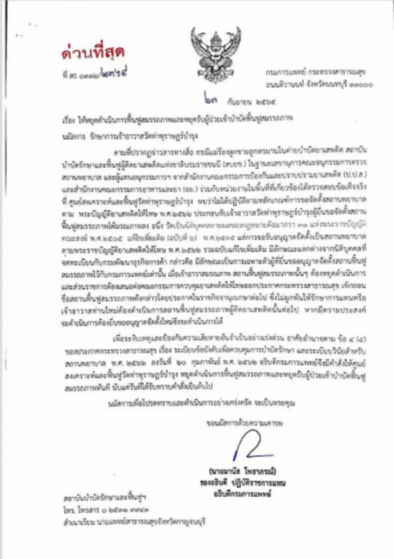 วันนี้ 24 กันยายน 2564 มีหนังสือด่วนที่สุดจากสาธารณสุข จ.กาญจนบุรี ถึงกรณีการประกาศปิดศูนย์ดังกล่าวที่วัดท่าพุราษฎร์บำรุง ลงนามโดย นายมานัส โพธาภรณ์ รองอธิบดี ปฏิบัติราชการแทนอธิบดีกรมการแพทย์ กระทรวงสาธารณสุข