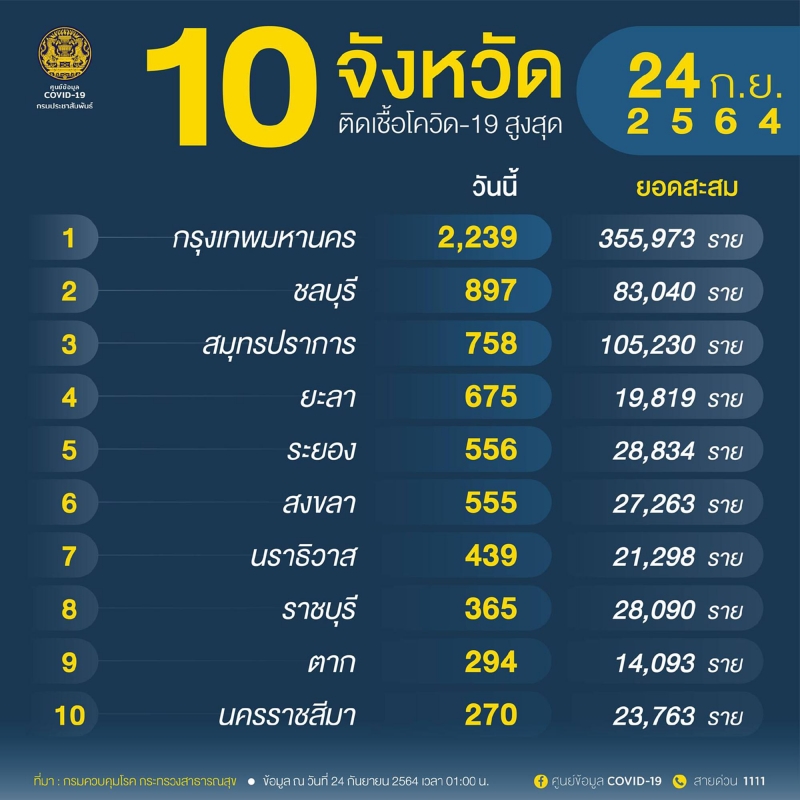 จํานวนผู้ติดCVในประเทศรายใหม่ วันที่ 24 กันยายน 2564 ตรวจสอบ 10 จังหวัดอันดับแรก