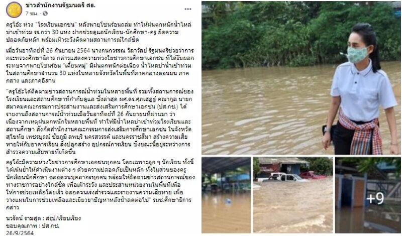 โดยทางเพจได้ลงโพสต์ดังกล่าวระบุข้อความว่า ครูโอ๊ะ ห่วง กศน.สุโขทัย หลังมวลน้ำเอ่อล้นสปิลเวย์เข้าท่วมสำนักงาน กศน.จังหวัด-อำเภอเมือง ฝากช่วยดูแลครู-นักศึกษา-ชุมชนโดยรอบ พร้อมเฝ้าระวังติดตามสถานการณ์ใกล้ชิด เผยความปลอดภัยต้องมาก่อน
