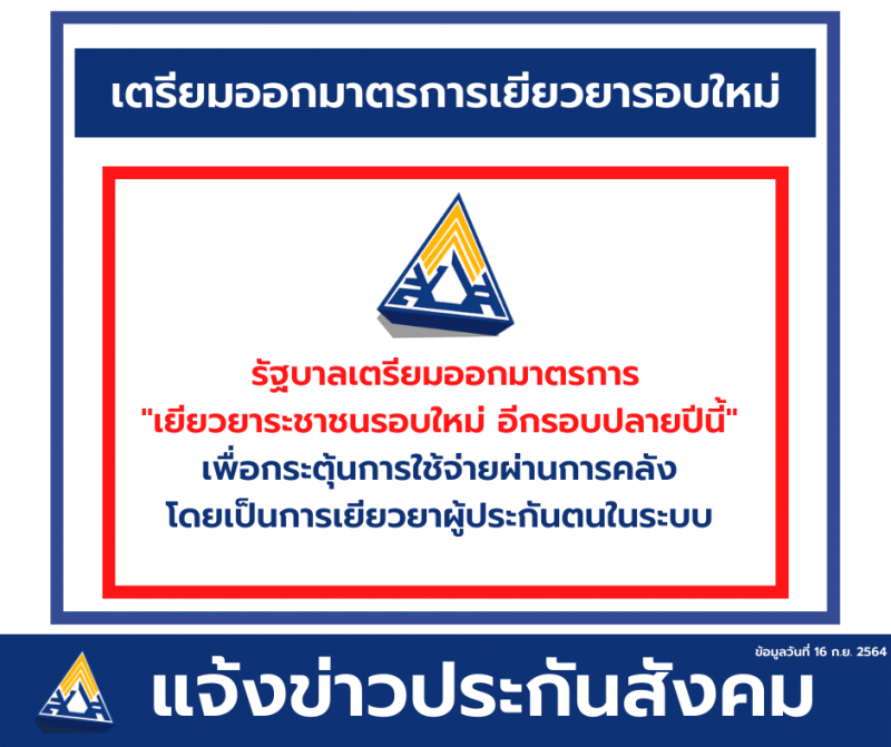วันที่ 29 กันยายน 2564 ผู้สื่อข่าวรายงานว่า รัฐบาลเตรียมกระตุ้นการใช้จ่ายเพื่อการบริโภคภาคเอกชนอีกครั้ง ผ่านมาตรการการคลัง โดยการเยียวยาผู้ประกันตนในระบบประกันสังคม ที่อยู่ในธุรกิจเอสเอ็มอี ทั้ง10 สาขา คาดว่าจะเป็นการเติมเงินในการใช้จ่ายของประชาชน ในช่วงเดือนธันวาคม 2564
