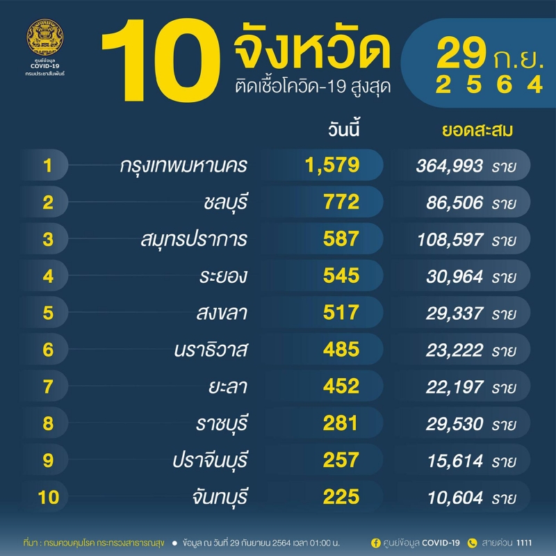 จํานวนผู้ติดcvในประเทศรายใหม่ วันที่ 29 กันยายน 2564 ตรวจสอบ 10 จังหวัดอันดับแรก