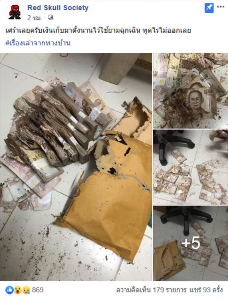 เป้นอีกหนึ่งเรื่องราวที่โซเชียลเข้ามาคอมเม้นท์กันเป็นจำนวนมาก หลัง Red Skull Society ได้โพสต์ภาพพร้อมระบุข้อความว่า เศร้าเลยครับเงินเก็บมาตั้งนานไว้ใช้ตอนฉุกเฉิน พูดไรไม่ออกเลย เรื่องเล่าจากทางบ้าน โดยหลังจากที่โพสต์ดังกล่าวเผยแพร่ออกไปก็มีคนเข้ามาแสดงความคิดเห็นอาทิเช่น งงที่ไม่ฝากธนาคาร หรือเอาไปซื้อทองมาเก็บนี่ละ แลกคืนได้นะคะลองไปธนาคารดู งงทำไมเก็บไว้แบบนี้ คนเก็บแบบนี้ดูแปลกๆมั้ย นั่นแหละที่กลัว พอได้มาต้องรีบใช้ให้หมด กลัวปลวกขึ้น