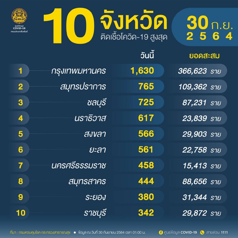 จํานวนผู้ติดcvในประเทศรายใหม่ วันที่ 30 กันยายน 2564 ตรวจสอบ 10 จังหวัดอันดับแรก