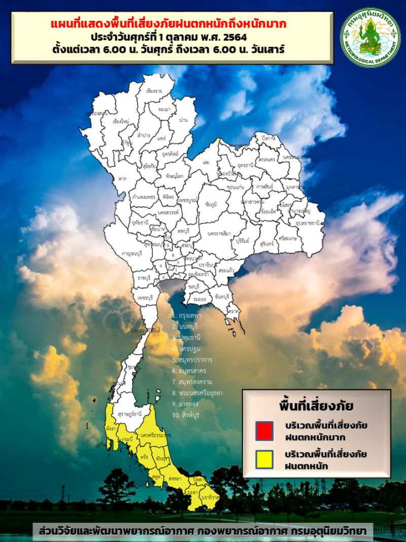 วันที่ 1 ตุลาคม 2564 กรมอุตุนิยมวิทยา พยากรณ์ลักษณะอากาศ 24 ชั่วโมงข้างหน้าว่าลักษณะอากาศทั่วไป มรสุมตะวันตกเฉียงใต้ที่พัดปกคลุมทะเลอันดามัน ประเทศไทย และอ่าวไทยเริ่มมีกำลังแรงขึ้น ลักษณะเช่นนี้ทำให้ประเทศไทยมีฝนฟ้าคะนองเกิดขึ้น โดยมีฝนตกหนักบางแห่งในภาคใต้