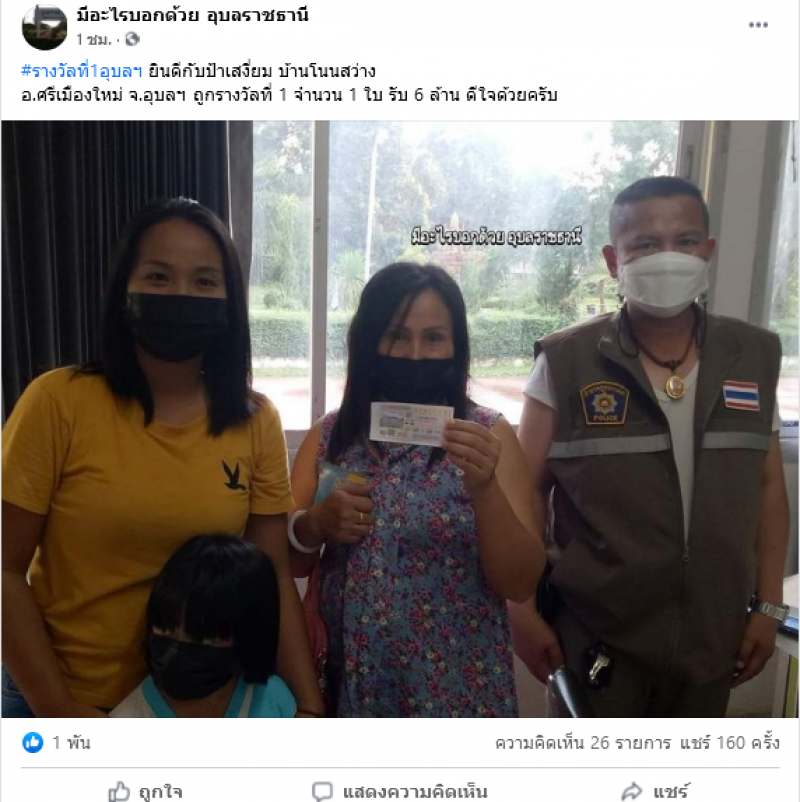 ล่าสุดเพจ มีอะไรบอกด้วย อุบลราชธานี ได้ออกมาโพสต์คนถูกรางวัลที่ 1 โดยได้ระบุข้อความว่า รางวัลที่1อุบลฯ ยินดีกับป้าเสงี่ยม บ้านโนนสว่าง อ.ศรีเมืองใหม่ จ.อุบลฯ ถูกรางวัลที่ 1 จำนวน 1 ใบ รับ 6 ล้าน ดีใจด้วยครับ