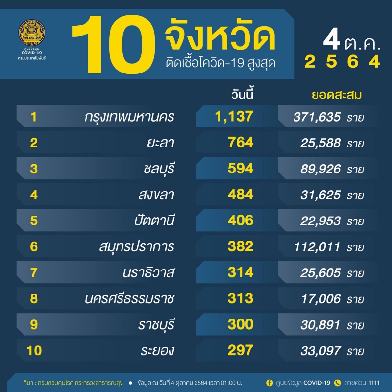 จํานวนผู้ติดในประเทศรายใหม่ วันที่ 4 ตุลาคม 2564 ตรวจสอบ 10 จังหวัดอันดับแรก