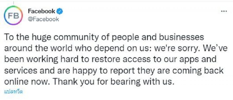 นอกกจากนั้น หลังจากที่ทุกอย่างกลับมาใช้งานได้ตามปกติทางด้าน ทางเฟซบุ๊ก ก็ได้ชี้แจงผ่านทวิตเตอร์อีกครั้งหนึ่ง โดยระบุว่า