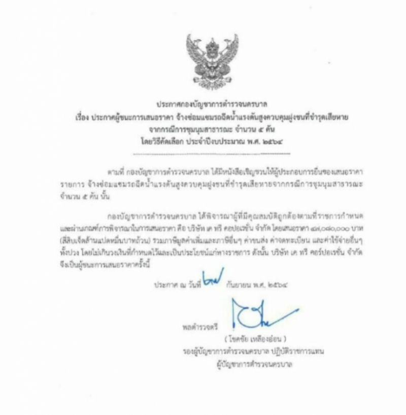 และผ่านเกณฑ์การพิจารณาในการเสนอราคา คือ บริษัท เค ทรี คอร์ปอเรชั่น จำกัด โดยเสนอราคา 47,080,000 บาท (สี่สิบเจ็ดล้านแปดหมื่นบาทถ้วน) รวมภาษีมูลค่าเพิ่มและภาษีอื่นๆ ค่าขนส่ง ค่าจดทะเบียน และค่าใช้จ่ายอื่นๆ ทั้งปวง