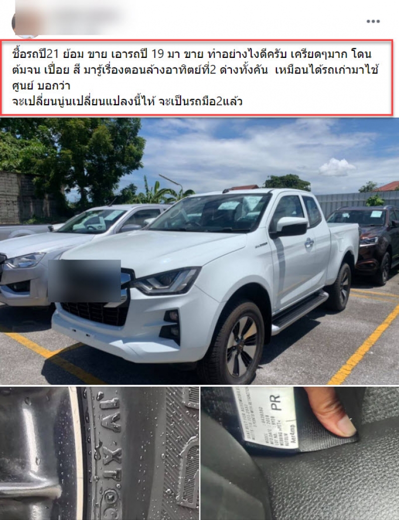 เรียกได้ว่าเป็นอีกหนึ่งเรื่องราวที่โลกออนไลน์เข้ามาแสดงความเห็นกันเป็นจำนวนมาก หลังผู้ให้เฟสบุ๊ครายหนึ่งได้ออกมาโพสต์เรื่องราวว่า ชื้อรถปี21 ย้อมขาย เอารถปี 19 มา ขาย ทำอย่างไงดีครับ เครียดๆมาก โดน ต้มจน เปื่อย สี มารู้เรื่องตอนล้างอาทิตย์ที่2 ด่างทั้งคัน เหมือนได้รถเก่ามาใช้ ศูนย์ บอกว่าจะเปลี่ยนนู่นเปลี่ยนแปลงนี้ให้ จะเป็นรถมือ2แล้ว