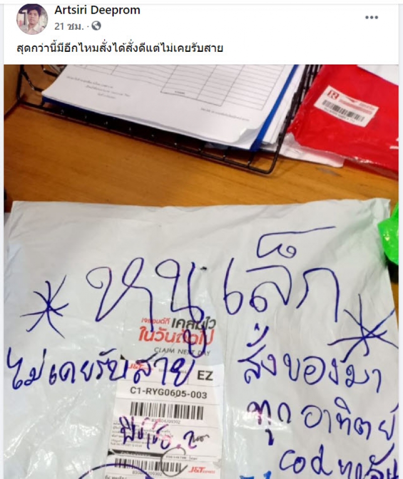 เรียกได้ว่าเป็นอีกหนึ่งเรื่องราวที่ดลกออนไลน์เข้ามาแสดงความเห็น และให้ความสนใจกันเป็นจำนวนมาก หลังผู้ใช้เฟสบุ๊ก Artsiri Deeprom ได้โพสต์ภาพพัสดุหนึ่งที่สั่งของมาแทบทุกวัน เป็นแบบ COD เก็บเงินปลายทาง แต่ลูกค้าไม่เคยรับโทรศัพท์เลย จนต้องเขียนใส่ซองพัสดุ โดยระบุว่า