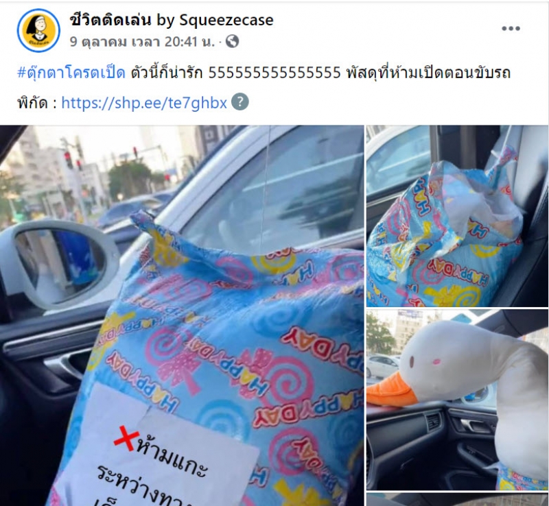 เป็นอีหนึ่งเรื่องราวที่โลกออนไลน์เข้ามาแสดงความเห็นกันเป็นจำนวนมาก หลัง เพจเฟสบุ๊ก ชีวิตติดเล่น by Squeezecase ได้โพสต์รีวิวตุ๊กตาเป็ดตัวใหญ่ ที่ตอนที่รับพัสดุมามีแป๊ะป้ายไว้ว่าห้ามแกะระหว่างทาง ทั้งนี้ยังได้ระบุข้อความว่า