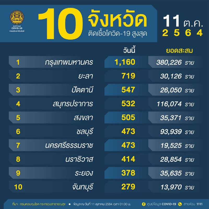 จํานวน ผู้ติดcvในประเทศรายใหม่ วันที่ 11 ตุลาคม 2564 ตรวจสอบ 10 จังหวัดอันดับแรก
