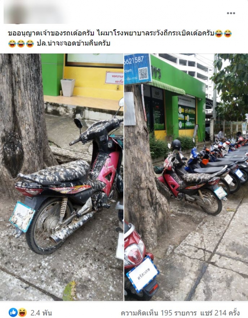 ทั้งนี้ผูใช้เฟสบุ๊คดังกล่าวยังไ้ระบุข้อความว่า ขออนุญาตเจ้าของรถเด้อครับ ไผมาโรงบาลระวังโดนกับดักเด้อครับ ปล.น่าจะจอดข้ามคืนครับ