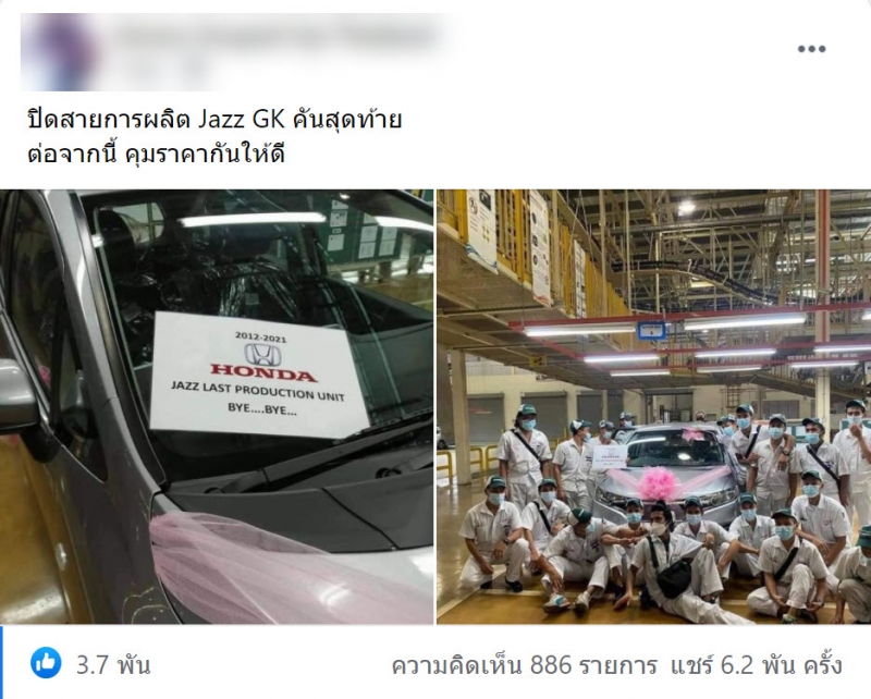 เมื่อวันที่ 15 ต.ค.64 บริษัท ฮอนด้า ออโตโมบิล (ประเทศไทย) จำกัด ชี้แจงกรณีโลกออนไลน์แชร์ภาพการผลิต Honda Jazz รถยนต์ซับคอมแพ็กต์รุ่นดังของฮอนด้า ที่ทำตลาดในเมืองไทยเป็นเวลายาวนานกว่า 20 ปี โดยผลิตคันสุดท้ายของโรงงานฮอนด้าที่ จ.ปราจีนบุรี มีป้ายเขียนว่า “2012-2021 Honda Jazz Last production Unit BYE BYE..นั้น