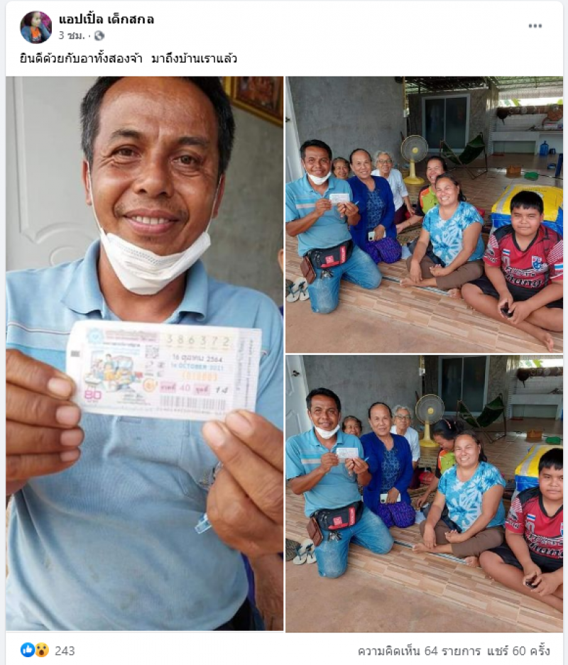 ล่าสุดเจอคนถูกรางวัลที่ 1 โดยผู้ใช้เฟสบุ๊ค แอปเปิ้ล เด็กสกล ได้ออกมาโพสต์ภาพพร้อมทั้งได้ระบุข้อความว่า ยินดีด้วยกับอาทั้งสองจ้า มาถึงบ้านเราแล้ว
