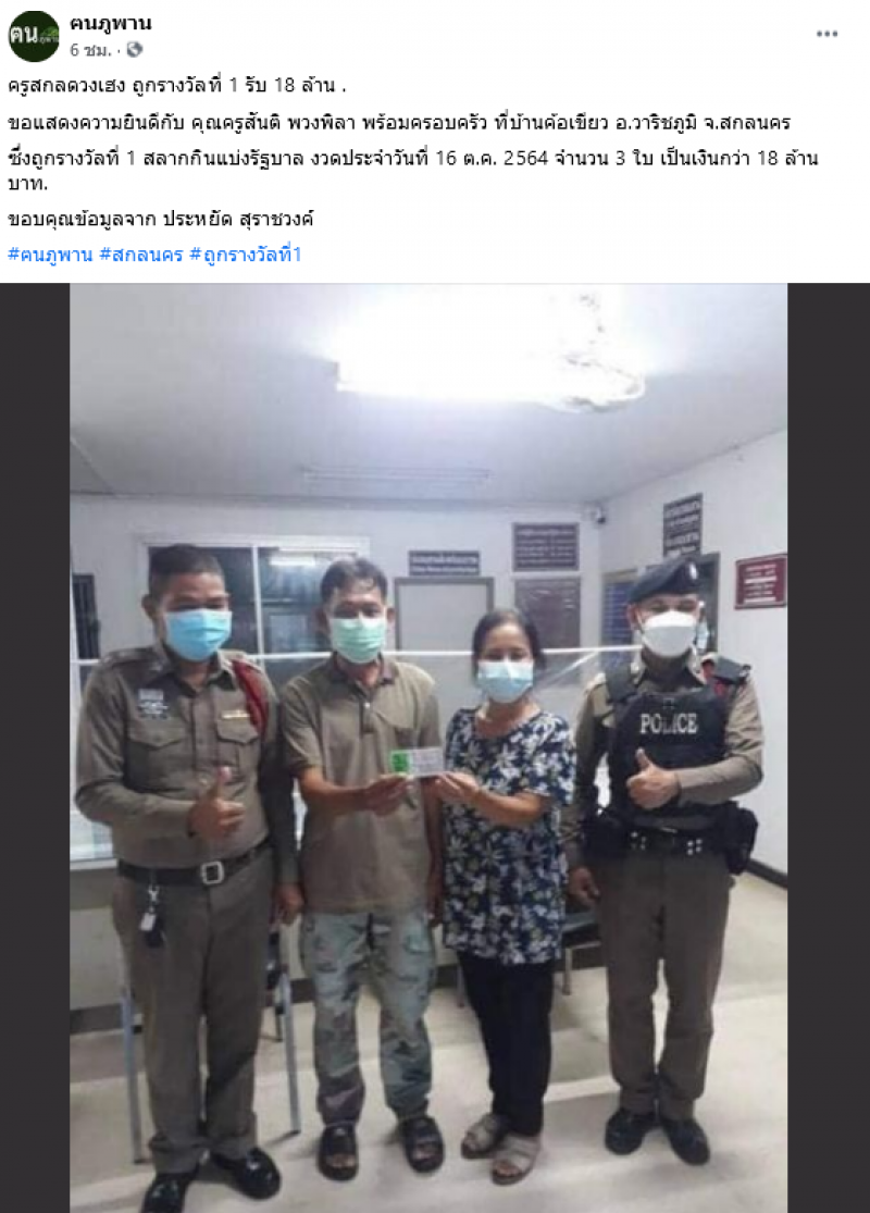 ล่าสุดพบคนถูกรางลวัลที่ 1 หลังมีผู้ใช้เฟสบุ๊ค ฅนภูพาน ได้ออกมาโพสต์ภาพพร้อมทั้งได้ระบุข้อความว่า