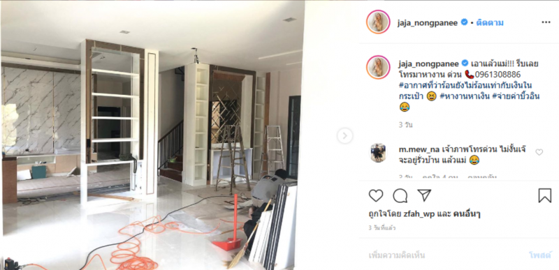 งานนี้สาวจ๊ะ ก็ได้ออกมาอัพเดทความคืบหน้า ผ่านทางอินสตาแกรมสวนตัว ให้แฟนๆได้ชมบรรยากาศภายในบ้านว่า ตอนนี้ไปถึงไหนแล้ว พร้อมแคปชั่นว่า เอาแล้วแม่ รีบเลย โทรมาหางาน ด่วน 0961308886 อากาศที่ว่าร้อนยังไม่ร้อนเท่ากับเงินในกระเป๋า หางานหาเงิน จ่ายค่าบิ้วอิน