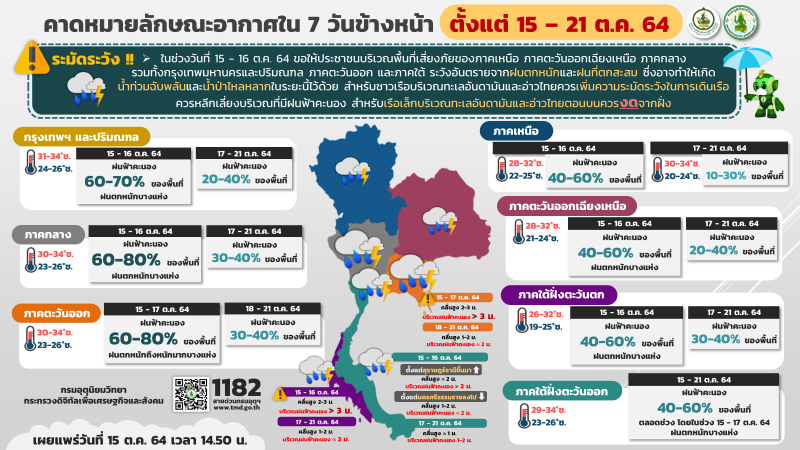 ลักษณะเช่นนี้ทำให้ภาคเหนือและภาคตะวันออกเฉียงเหนือมีฝนลดลง แต่ยังคงมี ฝนตกหนักบางแห่ง ในภาคตะวันออกเฉียงเหนือตอนล่าง ภาคกลางตอนล่าง ภาคใต้ตอนบน และภาคตะวันออก ขอให้ประชาชนในพื้นที่เสี่ยงภัยดังกล่าวระวังอันตรายจาก ฝนตกหนัก และฝนที่ตกสะสมซึ่งอาจทำให้เกิดน้ำท่วมฉับพลันและน้ำป่าไหลหลากไว้ด้วย