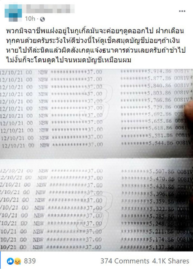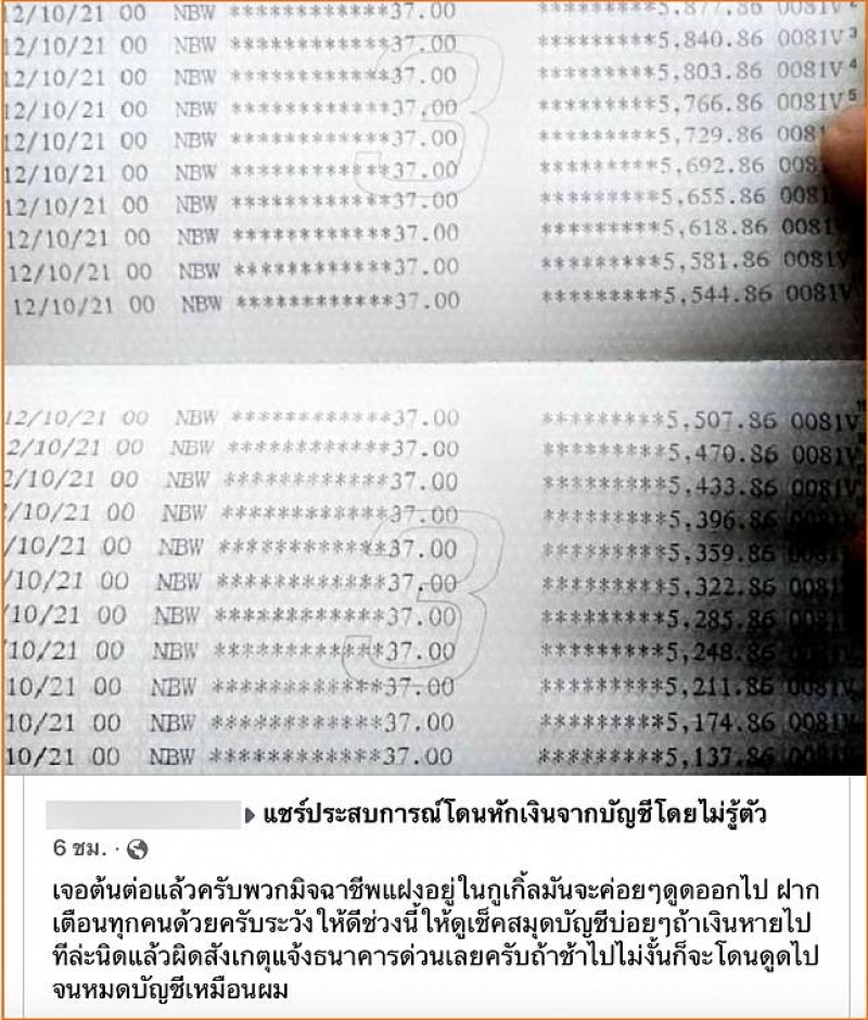 ล่าสุดผู้ใช้เฟซบุ๊กได้ออกมา แชร์ประสบการณ์โดนหักเงินจากบัญชีไม่รู้ตัว ระบุข้อความว่า