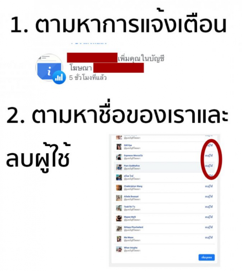 3.สำหรับคนที่โดนหักเงินจาก facebook นำเงินไปจ่ายค่ายิงแอดโฆษณา ให้เข้าไปที่ดูการแจ้งเตือนว่า มีคนดึงบัญชีของเราเข้าไปบัญชีโฆษณาของ Facebook หรือไม่ หลังจากนั้นให้ไปไล่หาชื่อของเรา ตรงบทบาทผูดูแลบัญชี และกดลบผู้ใช้ออกทันที หลังจากนั้นให้ลบบัญชีที่ทำไว้เพื่อทำธุรกรรมผ่านเฟซบุ๊กออก