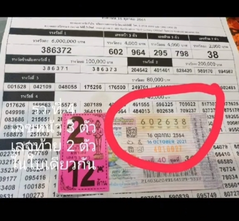 ถูกรางวัลที่ 4 (602638) มูลค่า 40,000 บาท รางวัลเลขหน้า 3 ตัว (602) 4,000 บาท และรางวัลเลขท้าย 2 ตัว (38) อีก 2,000 บาท รวมแล้วลอตเตอรี่ใบเดียว ได้เงินรางวัลถึง 3 เด้ง ทั้งหมด 46,000 บาท เลยทีเดียว