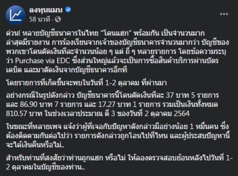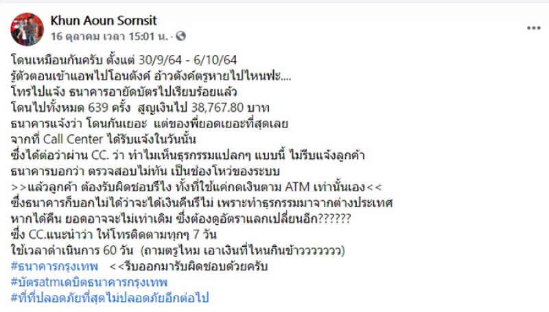 ล่าสุด ผู้ใช้เฟซบุ๊ก สัญชัย ศรสิทธิ์ หนึ่งในผู้เสียหายที่เงินหายไปจากบัญชีรัว ๆ หลายครั้ง จนสูญเงินไปกว่า 38,767.80 บาท ซึ่งได้โทร. ไปแจ้งธนาคารอายัดบัตรไปเรียบร้อยแล้ว สรุปรวมโดนไปทั้งหมด 639 ครั้ง ธนาคารแจ้งว่า โดนกันเยอะ แต่ของพี่ยอดเยอะที่สุดเลย