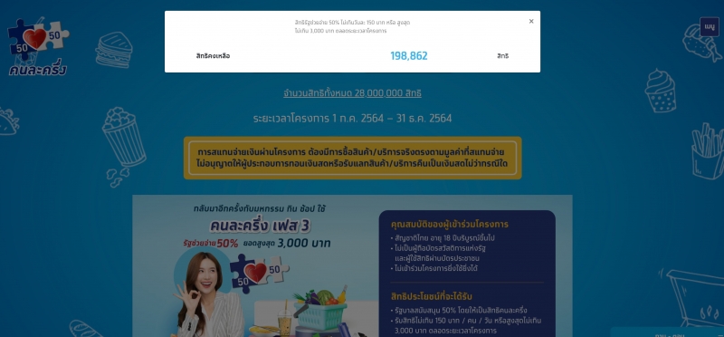 ข้อมูลล่าสุด 19 ต.ค.64 เวลา 15.20 น. พบว่า โครงการคนละครึ่ง เฟส 3 ยังมีสิทธิคงเหลืออยู่ราว 1.98 แสนสิทธิ