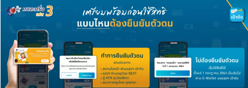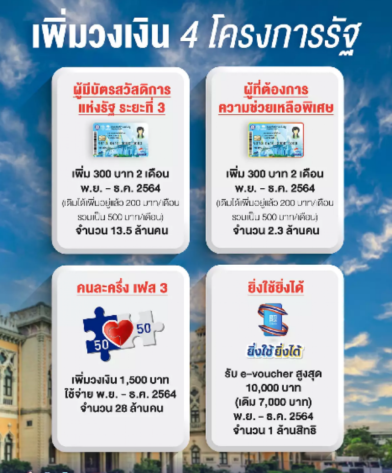 เพิ่ม 300 บาท 2 เดือน พ.ย.- ธ.ค.64 (เดิมได้เพิ่มอยู่แล้ว 200 บาท/เดือน รวมเป็น 500 บาท/เดือน) จำนวน 2.3 ล้านคน คนละครึ่ง เฟส 3
