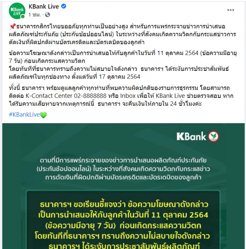 ทั้งนี้ ธนาคารฯ พร้อมดูแลลูกค้าทุกท่านที่พบความผิดปกติของรายการธุรกรรม โดยสามารถติดต่อ K-Contact Center 02-8888888 หรือ Inbox เพื่อให้ KBank Live ช่วยตรวจสอบ หากได้รับความเสียหายจากเหตุการณ์นี้ ธนาคารฯ จะคืนเงินให้ภายใน 24 ชั่วโมงค่ะ #KBankLive
