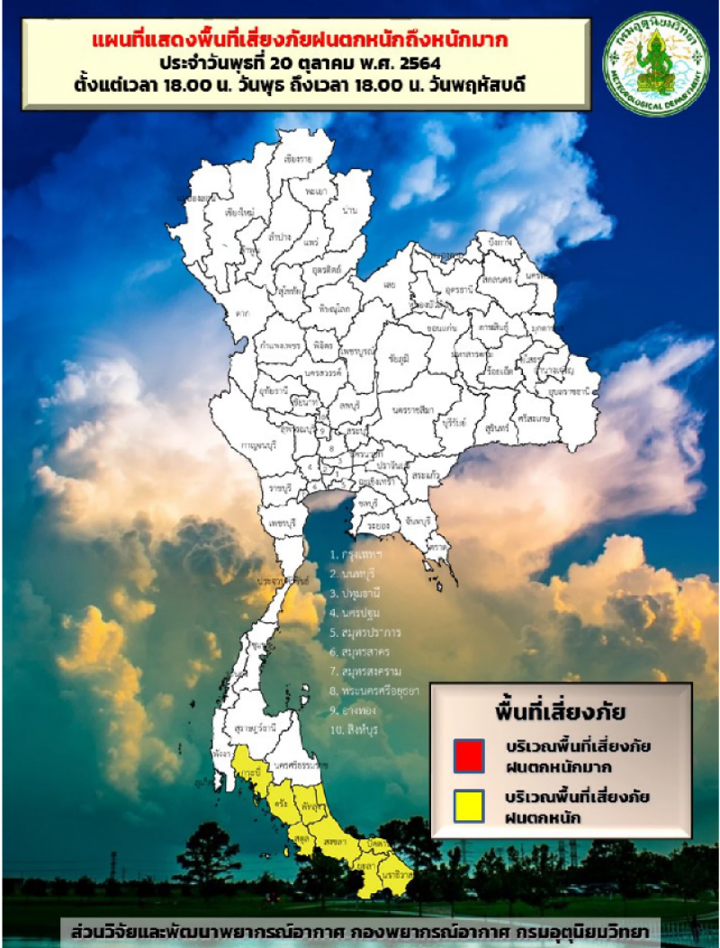ด้านพยากรณ์อากาศประจำวันที่ 20 ตุลาคม 2564 ลักษณะอากาศทั่วไป พยากรณ์อากาศ 24 ชั่วโมงข้างหน้า บริเวณความกดอากาศสูงจากประเทศจีนที่ปกคลุมประเทศไทยตอนบน และทะเลจีนใต้ มีกำลังอ่อนลง ประกอบกับมีลมตะวันออกพัดปกคลุมอ่าวไทย ภาคใต้
