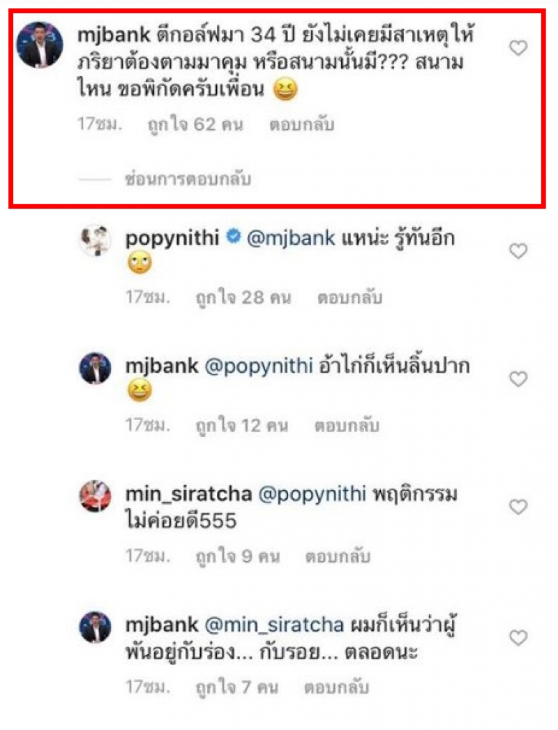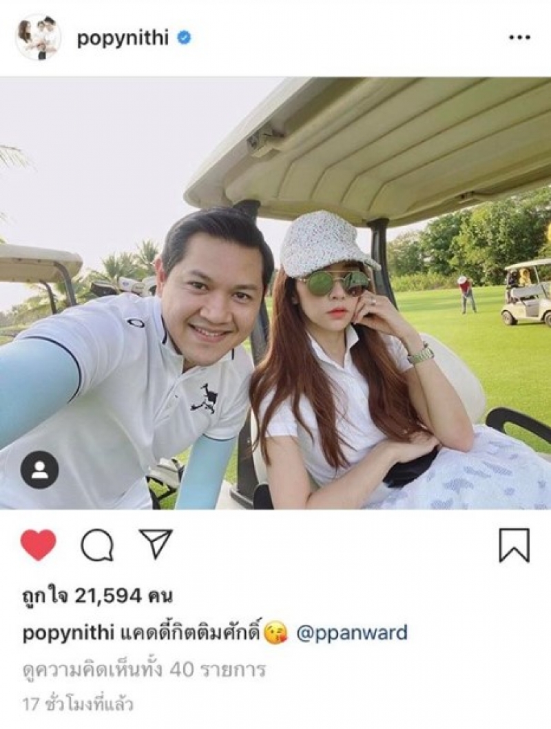 ล่าสุด สาวเป้ยก็ตามสามีไปถึงสนามกอล์ฟ และหลังจากที่หนุ่มป๊อปโพสต์รูปเพื่อนซี้อย่าง แบงค์ พชร สามี นิหน่า สุฐิตาก็เข้ามาคอมเมนต์แซวเลยว่า ตีกอล์ฟมา 34 ปี ยังไม่เคยมีสาเหตุให้ภริยาต้องตามมาคุม หรือสนามนั้นมี สนามไหน ขอพิกัดครับเพื่อน และมีเพื่อนคนอื่นๆร่วมวงแซวว่า พฤติกรรมไม่ค่อยดี555
