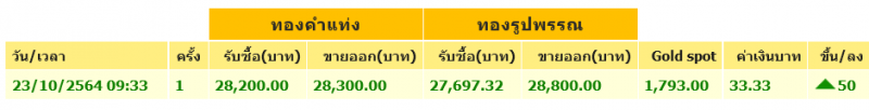 สำหรับ ราคาทองวันนี้ 23 ตุลาคม 2564 ประกาศ เมื่อเวลา 09:33 น. (ครั้งที่ 1)