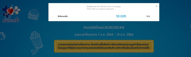 จากการตรวจสอบข้อมูลล่าสุด วันที่ 22 ต.ค.64 เวลาประมาณ 16.45 น. คนละครึ่ง เฟส 3 ยังมีสิทธิเหลือประมาณ 5.9 หมื่นสิทธิ ลงทะเบียนผ่านเว็บไซต์ www.คนละครึ่ง.com/ หรือผ่าน g-Wallet บนแอปพลิเคชัน “เป๋าตัง” โดยจะได้รับวงเงินรวม 4,500 บาท ส