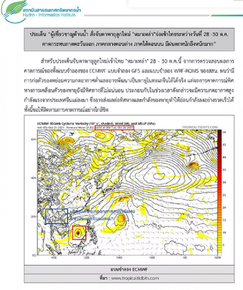 สถาบันสารสนเทศทรัพยากรน้ำ (องค์การมหาชน) หรือ สสน. ออกมาประกาศเเจ้งเตือนให้จับตาพายุลูกใหม่เข้าไทย พายุ หมาเหล่า ในช่วงระหว่างวันที่ 28 - 30 ต.ค.นี้ จากการตรวจสอบผลการคาดการณ์ของทั้งแบบจำลองของ ECMWF