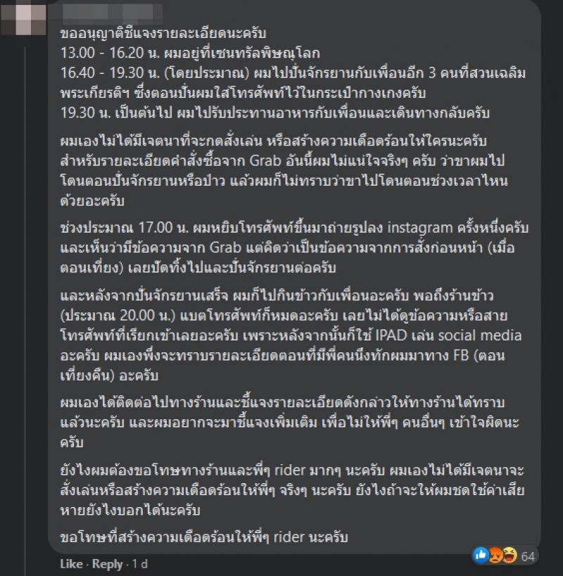 กระทั่งตอน 5 โมงตนเห็นข้อความจากไรเดอร์ แต่คิดว่าเป็นข้อความการสั่งก่อนหน้าจึงปัดทิ้งไป แล้วก็ไปปั่นจักรยานต่อ เมื่อปั่นจักรยานเสร็จช่วง 2 ทุ่ม ก็ไปรับประทานอาหาร ช่วงนั้นแบตโทรศัพท์ตนหมดแล้ว เลยไม่ได้ดูข้อความหรือสายที่เรียกเข้า มาทราบรายละเอียดเรื่องนี้อีกครั้งตอนเที่ยงคืน ซึ่งตนได้ชี้แจงกับทางร้านและขอโทษกับเรื่องที่เกิดขึ้น และพร้อมชดใช้ค่าเสียหายให้ไรเดอร์คนนี้