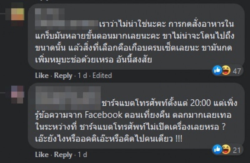 งานนี้ ชาวเน็ตหลายคนกลับไม่เชื่อคำชี้แจง โดยมองว่า การที่จะกดสั่งอาหารได้นั้น มันต้องผ่านหลายขั้นตอนกว่าจะไปถึงขั้นตอนสุดท้าย ซึ่งขาก็ไม่น่าจะโดนถึงขนาดนั้นได้ รวมถึงการสั่งเมนูอาหาร มีการเจาะจงเลือกเครื่องเคียง เพิ่มเครื่องเคียงแบบครบเซตอีกด้วย มันจึงไม่น่าบังเอิญโดนมือถือขนาดนี้