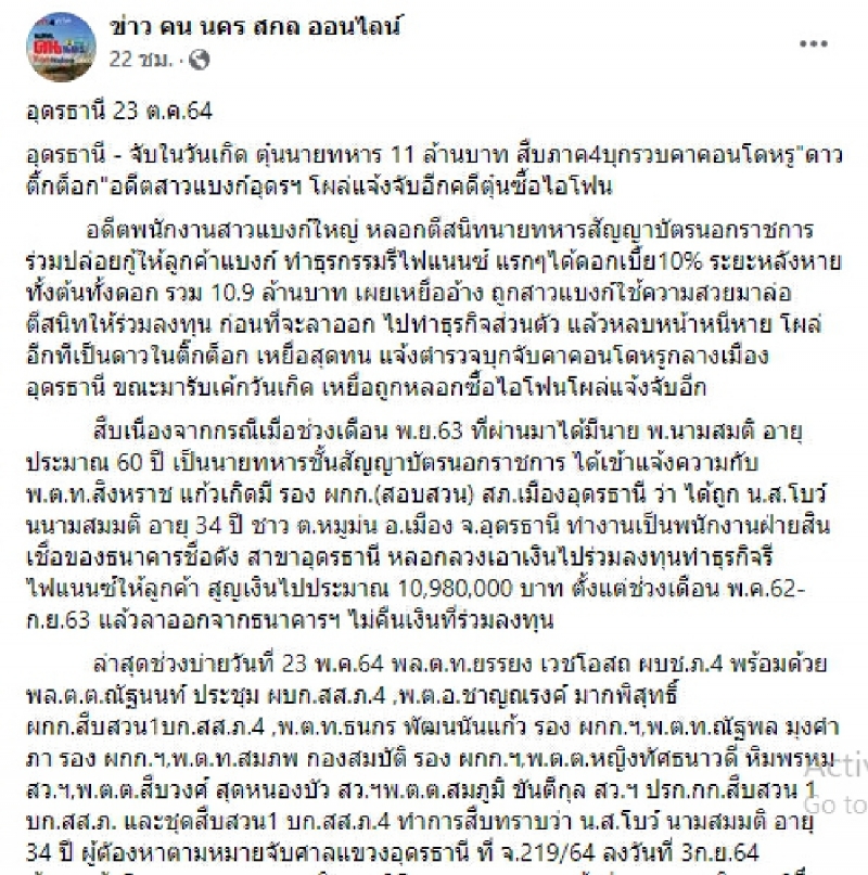 เผยอ้าง ถูกสาวแบงก์ใช้ความสวยมาตีสนิทให้ร่วมลงทุน ก่อนที่จะลาออก ไปทำธุรกิจส่วนตัว แล้วหลบหนีไปเลย โผล่อีกทีเป็นดาวTiktok ก่อนแจ้งตำรวจบุกจับคาคอนโดหรูกลางเมืองอุดรฯ ขณะมารับเค้กวันเกิด