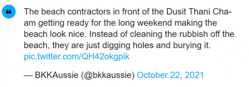 เป็นอีกหนึ่งคลิปวิดีโอที่ทำให้ทั้งชาวไทยและชาวต่างชาติเกิดเสียงวิพากษ์วิจารณ์อย่างหนัก เมื่อผู้ใช้งานทวิตเตอร์ BKKAussie ซึ่งน่าจะเป็นชาวต่างชาติที่อาศัยอยู่ในประเทศไทย เผยคลิปวิดีโอกลุ่มคนกำลังขุดหลุมทิ้งขยะและไถกลบบริเวณริมชายหาด