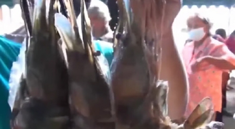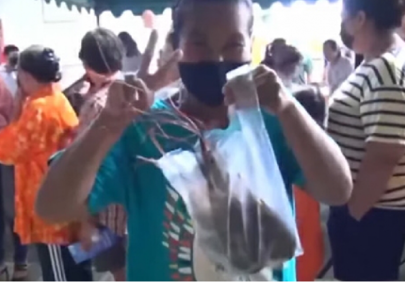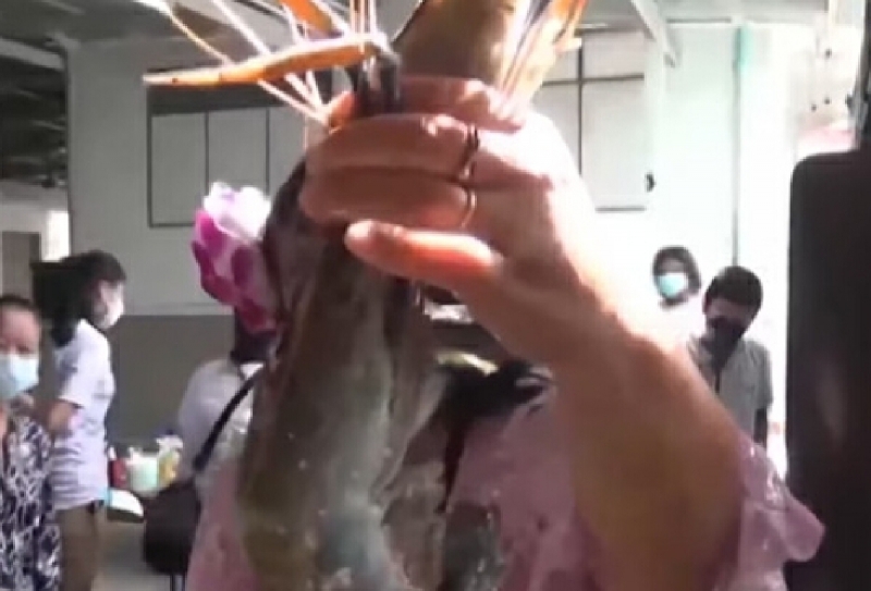 สาวใจเจ๊ ให้กุ้งแม่น้ำตัวใหญ่เท่าฝ่ามือให้กินฟรี ๆ ในงานบุญกฐิน