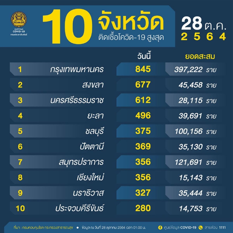 อัพเดทต่อเนื่อง เกาะติดสถานการณ์ วันนี้ 28 ต.ค. 64 เกาะติดความคืบหน้า จากศูนย์บริหารสถานการณ์cv (ศบค.) ตรวจสอบ อัพเดท 10 จังหวัดอันดับพบผู้ติดcv สูงสุด