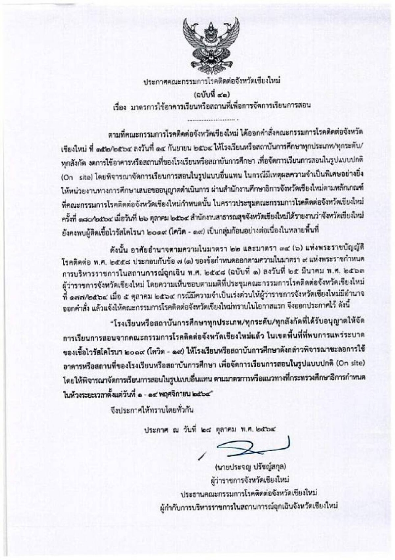 เชียงใหม่ ที่ ๑๕๒/๒๕๖๔ ลงวันที่ ๙๔ กันยายน ๒๕'๖๔ ให้โรงเรียนหรือสถาบันการศึกษาทุกประเภท/ทุกระดับ/