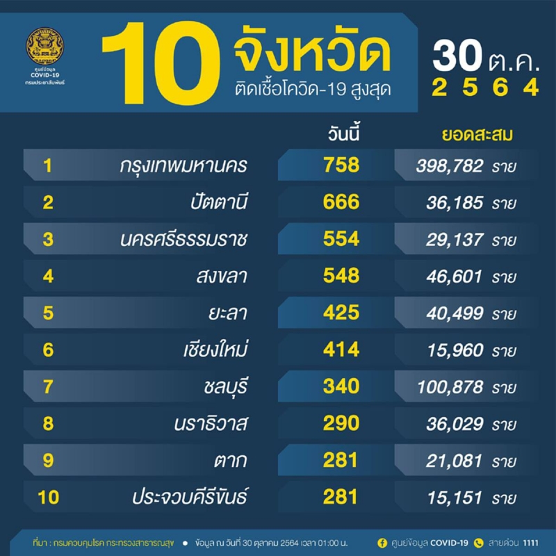 จํานวนผู้ติดเชื้อโควิดในประเทศรายใหม่ วันที่ 30 ตุลาคม 2564 ตรวจสอบ 10 จังหวัดอันดับ