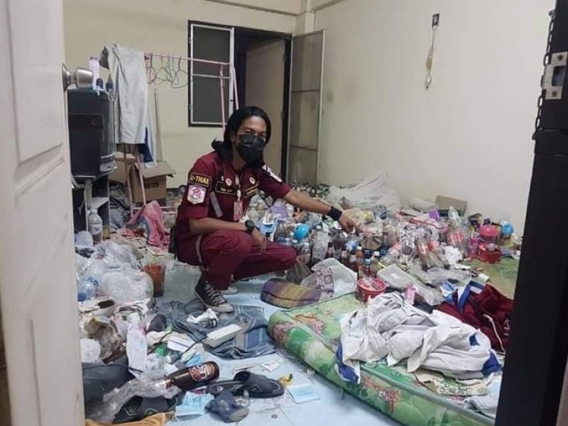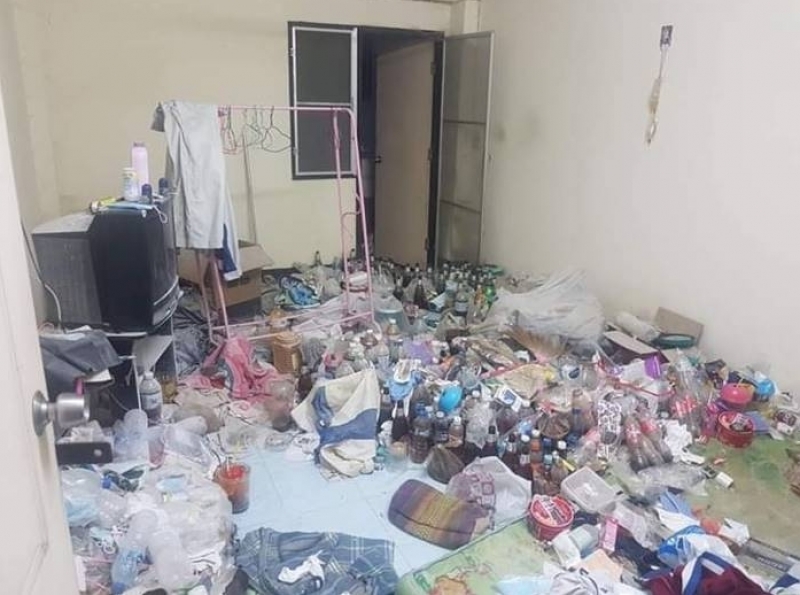 โดยขยะในห้องมีทั้งขวดน้ำดื่ม พื้นห้องเต็มไปด้วยฝุ่น เศษผม กระดาษใช้แล้ว ซองขนม กล่องโฟมใส่อาหาร แก้วน้ำพลาสติก และผ้าที่ใช้แล้วที่ถูกทิ้งตามพื้นและส่งกลิ่นเหม็นไปทั่ว นอกจากนี้ยังมีโทรทัศน์ 1 เครื่อง