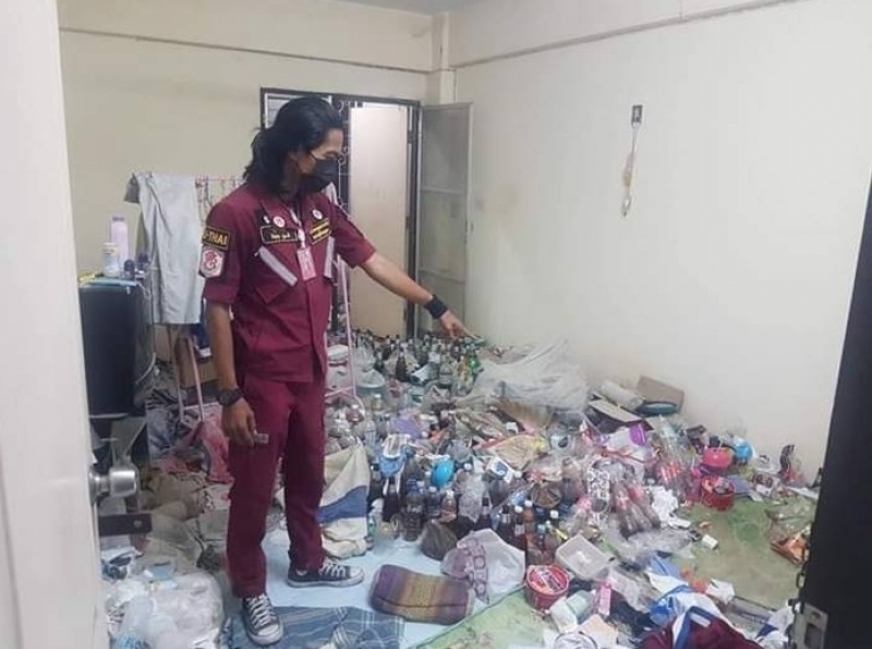 และไม่เจอหน้าอีกเลย ด้วยความเป็นห่วงว่าจะเป็นตามข่าวที่เห็น จึงตัดสินใจโทร. แจ้งเจ้าหน้าที่กู้ภัยมาเปิดห้อง ก็ห้องอยู่ในสภาพดังกล่าว ที่เต็มไปด้วยขยะ