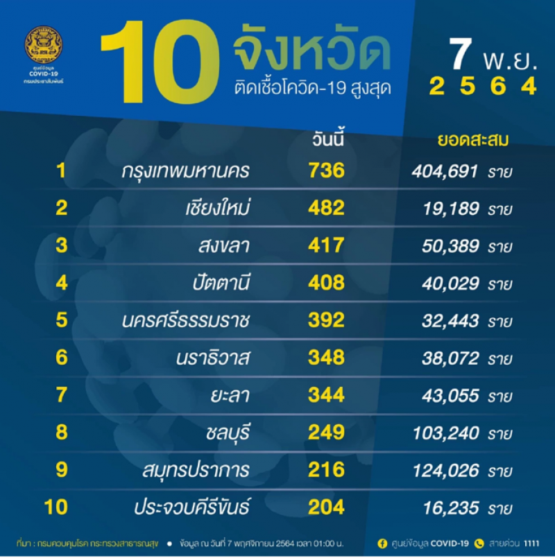 1.กรุงเทพมหานคร 736 ราย สะสม(1 เม.ย.-7 พ.ย.64) 404,691 ราย