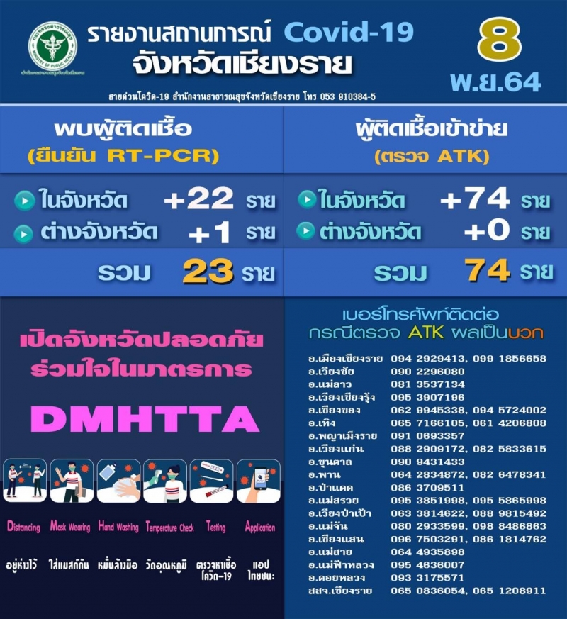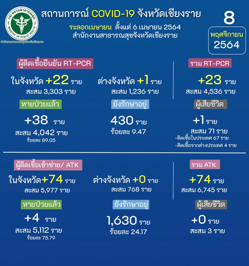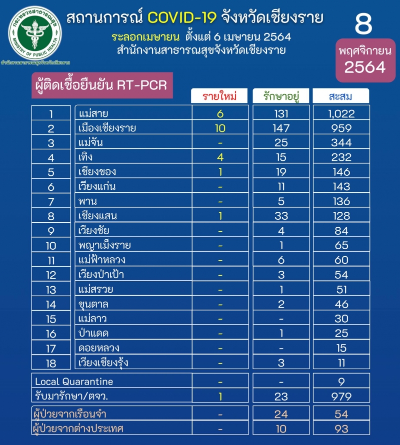 วันที่ 8 พ.ย.64 ผู้สื่อข่าวรายงานว่า รายงานศูนย์ปฏิบัติการควบคุมโรค (ศปก.) จ.เชียงราย