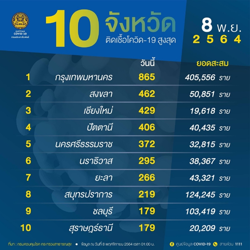 จํานวนผู้ติในประเทศรายใหม่ วันที่ 8 พฤศจิกายน 2564 ตรวจสอบ 10 จังหวัดอันดับ