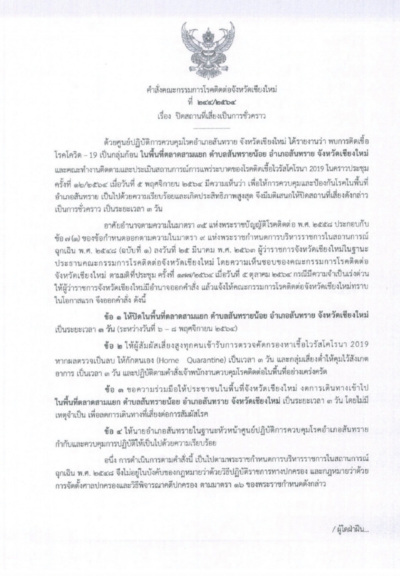 เป็นระยะเวลา 14 วัน ระหว่างวันที่ 4 17 พฤศจิกายน 2564 ,ตลาดสามแยก ตำบลสันทรายน้อย อำเภอสันทราย จังหวัดเชียงใหม่ เป็นระยะเวลา 3 วัน ระหว่างวันที่ 6 8 พฤศจิกายน 2564