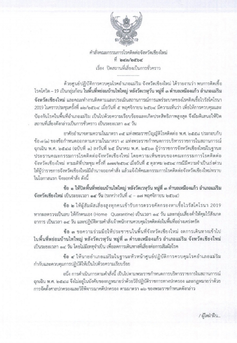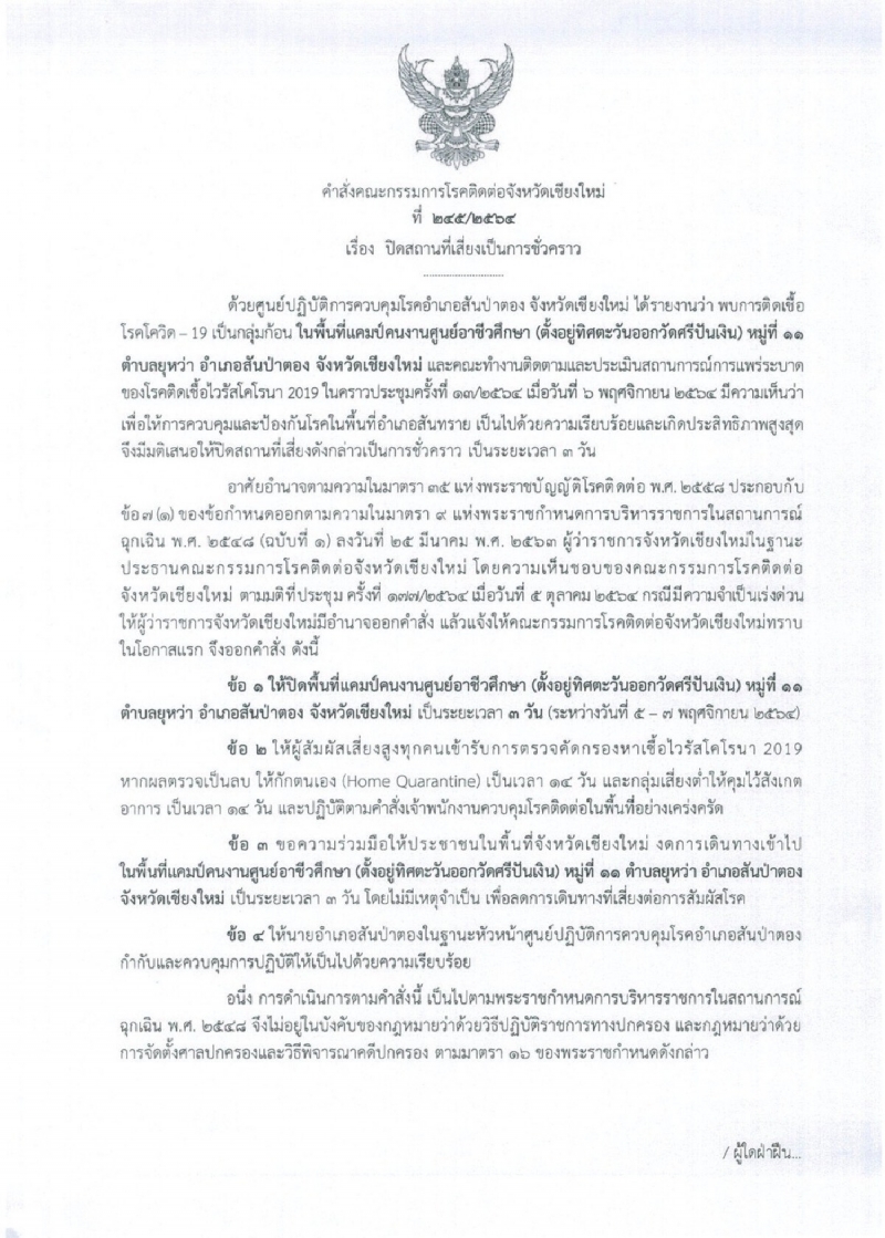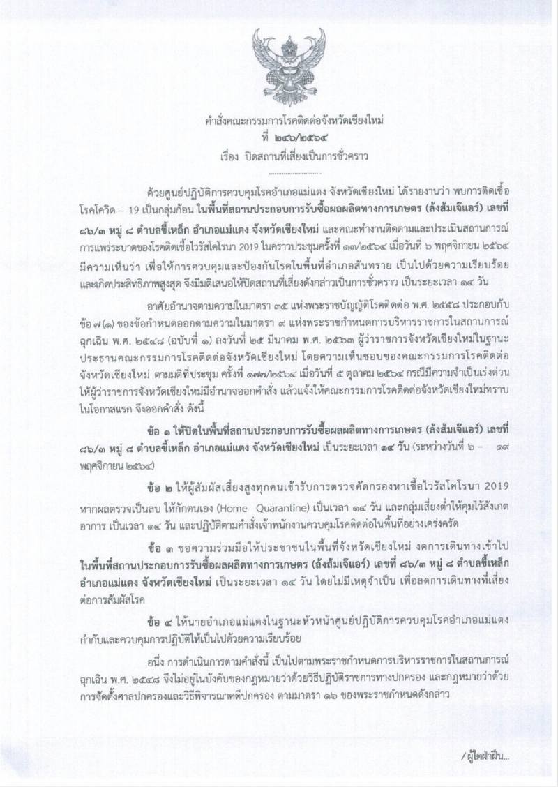 และสถานประกอบการรับซื้อผลผลิตทางการเกษตร (ล้งส้มเจ๊แอร์) เลขที่ 86/3 หมู่ 8 ตำบลขี้เหล็ก อำเภอแม่แตง จังหวัดเชียงใหม่ ปิดเป็นระยะเวลา 14 วัน ระหว่างวันที่ 6 19 พฤศจิกายน 2564
